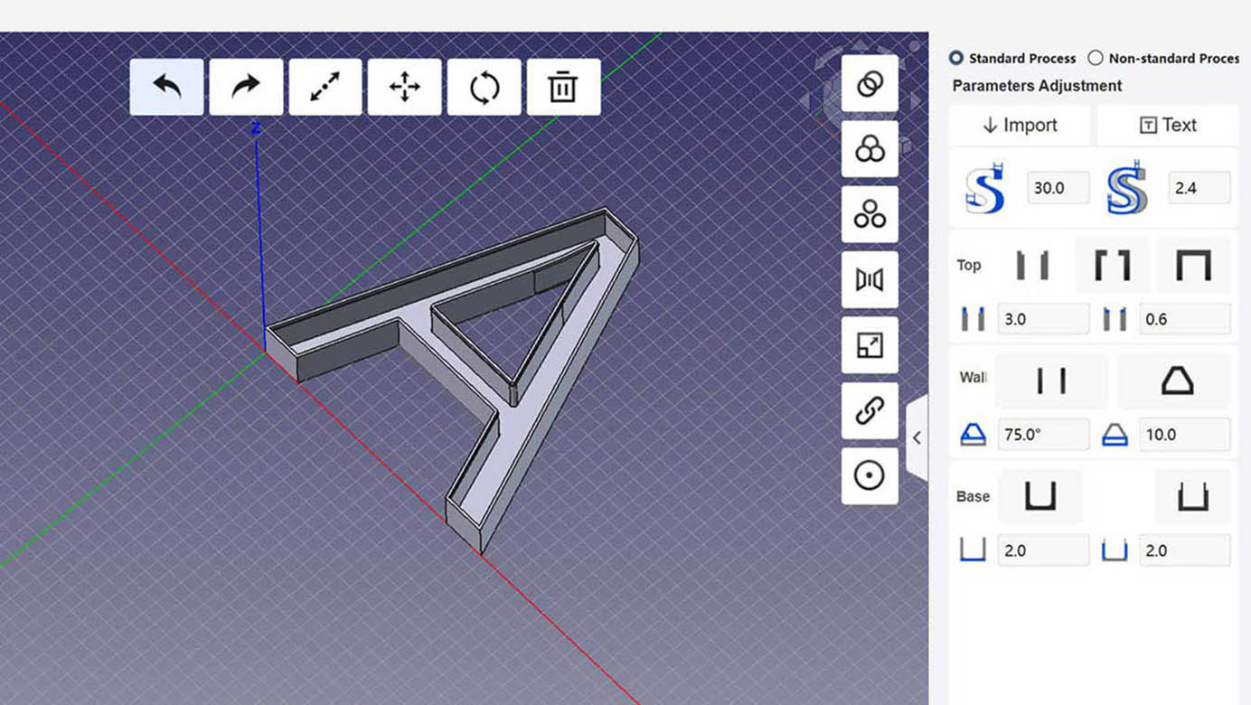 Step 1: Import a 2D file or input text. Step 2: Adjust parameters to generate the model (configurable parameters include: wall thickness, base thickness, overall letter height, letter thickness, and step width and height).