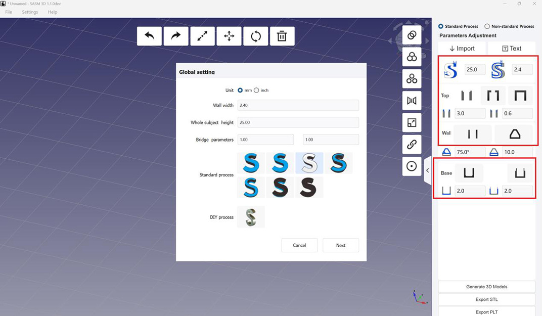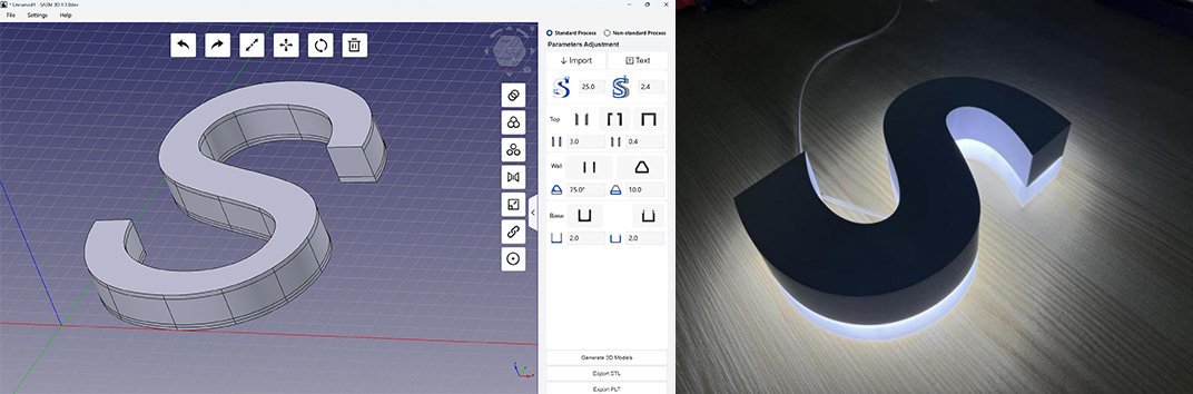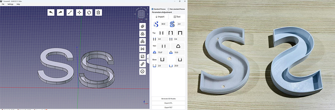 Full process production flow: Step 1: Import a 2D file or enter text. Step 2: Adjust parameters to generate the model (the configurable parameters include: wall thickness, base thickness, overall letter height, letter thickness, step width, step height) .